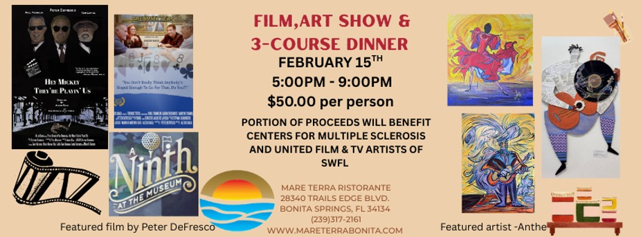 Join us for an unforgettable evening brimming with creativity and culture! Experience the captivating short films of Peter DeFresco alongside the extraordinary talents of the United Film & Television artists of Southwest Florida. Delight your senses at a stunning art show that beautifully intertwines music and dance, curated by our special artist, Anthe. And as the perfect finishing touch, indulge in an exquisite three-course Italian dinner that will tantalize your taste buds. Don’t let this enchanting evening pass you by—come and be a part of the magic!